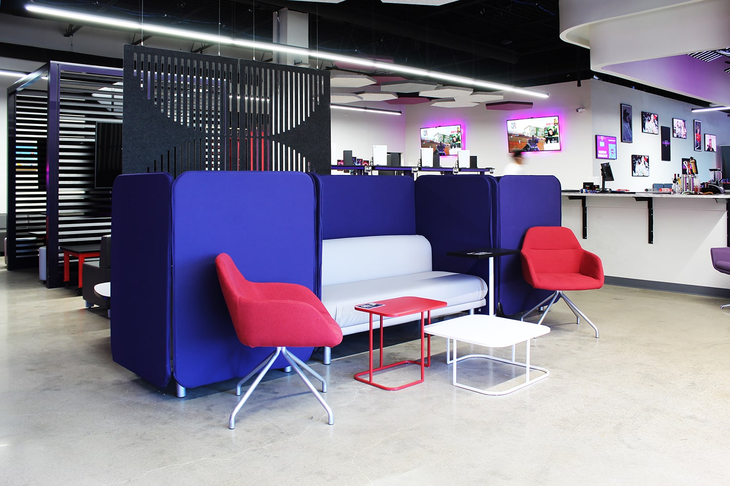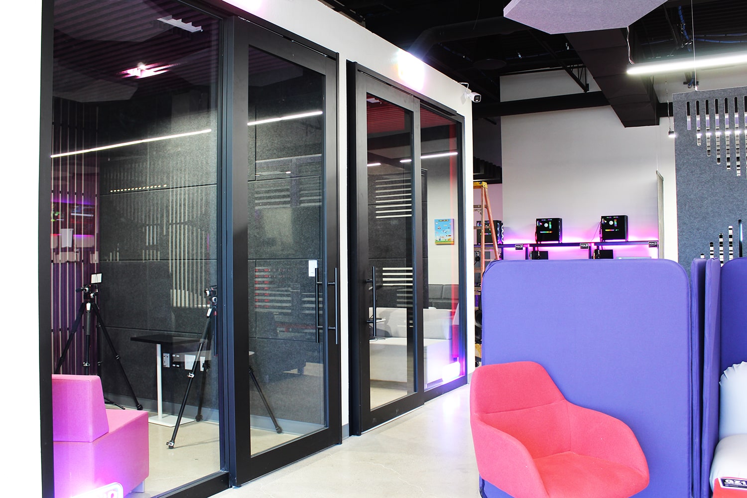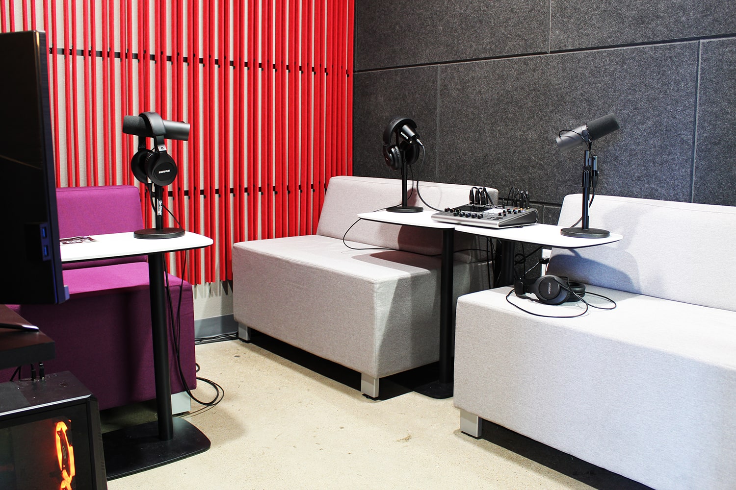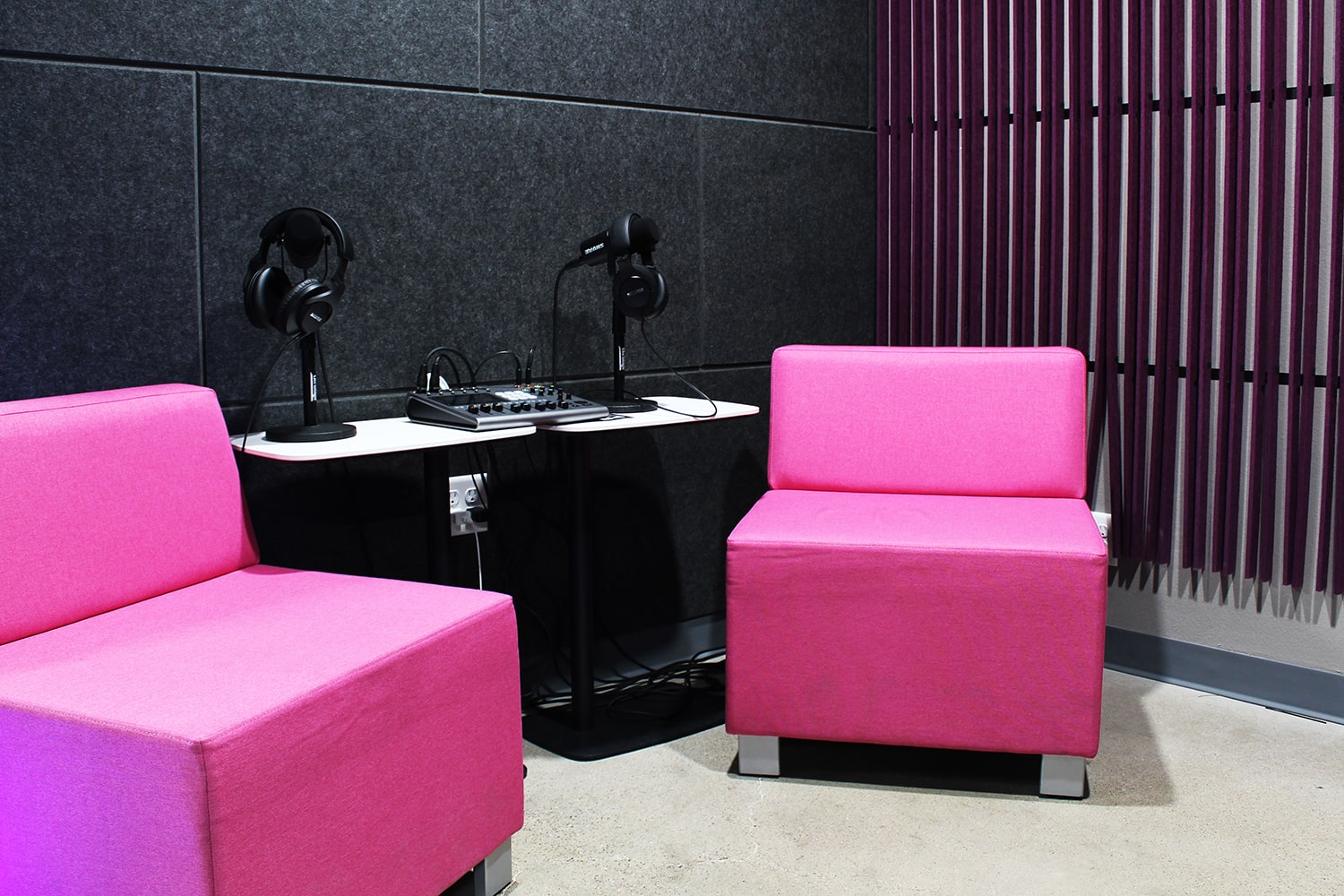 CORE Office Interiors supplied all furniture fixtures, custom podcast rooms with glass walls and fronts, acoustic treatments, and low-voltage cabling infrastructure throughout the space.