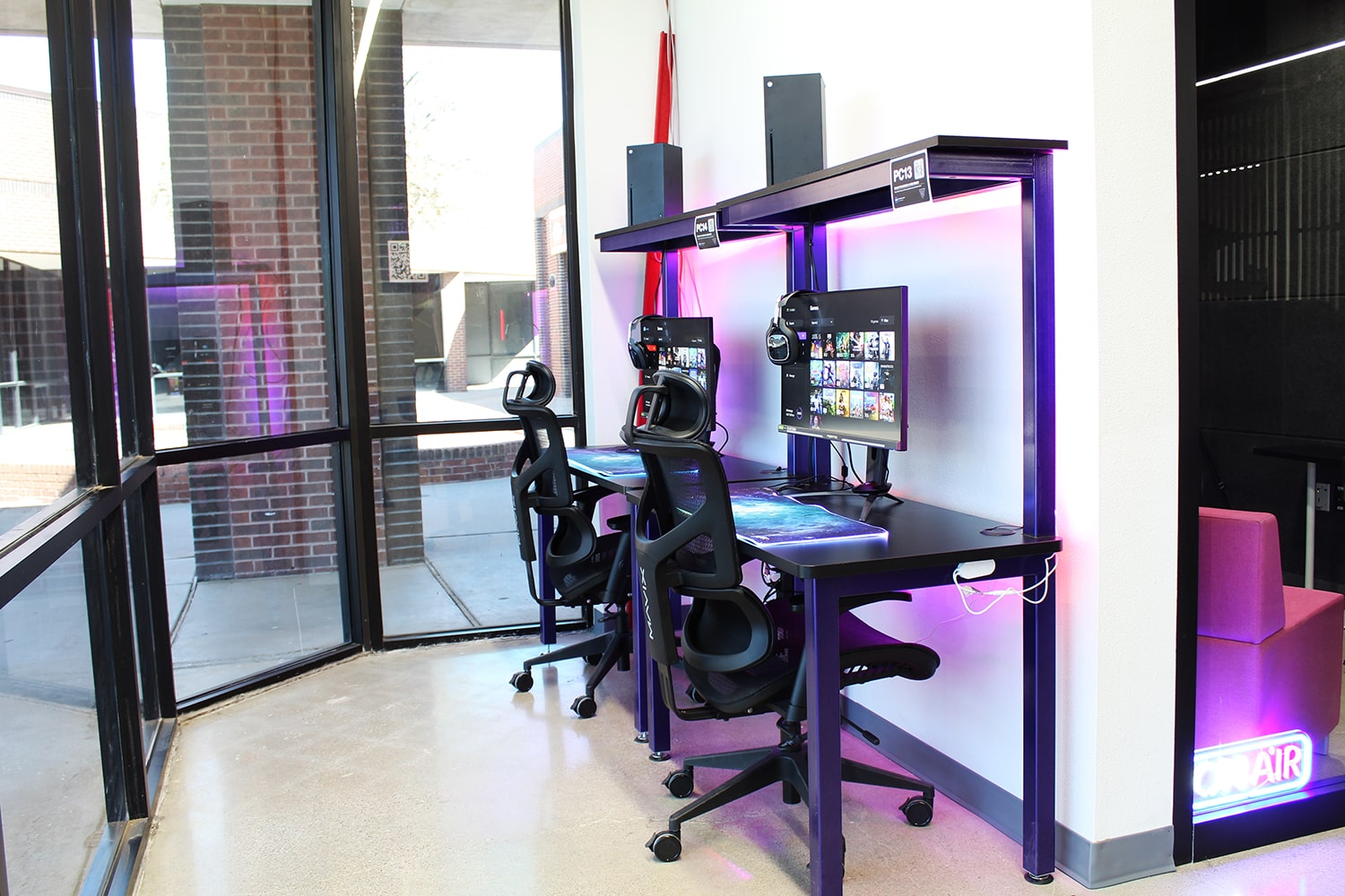 The main arena features a stage with movable PC desks that can be arranged for head-to-head tournament play or repositioned for classroom and presentation formats.