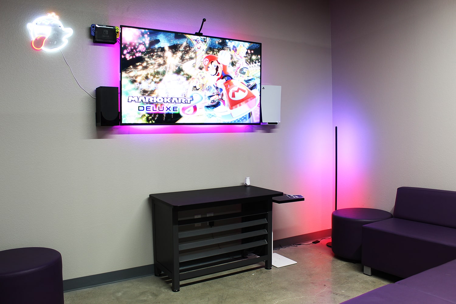 We installed approximately two dozen displays including nine mounted Samsung frames, creating a fully immersive visual environment that supports both individual gaming and group presentations.